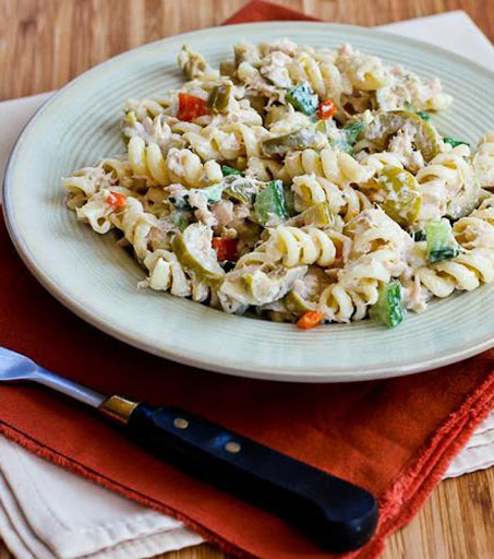 In a large bowl, combine pasta, tuna, garbanzo beans, sun-dried tomatoes, and scallions.