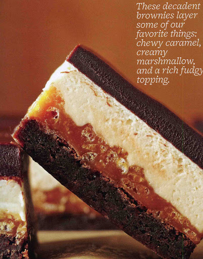 5. For chocolate layer, in a small saucepan cook and stir semisweet chocolate pieces, 1/4 cup butter, and whipping cream over low heat until chocolate is melted and smooth. Pour chocolate mixture over nougat layer, spreading to edges. Cover loosely and chill for 2 hours. Using the edges of the foil, lift uncut brownies out of pan. Cut into brownies. Makes 64 brownies.
