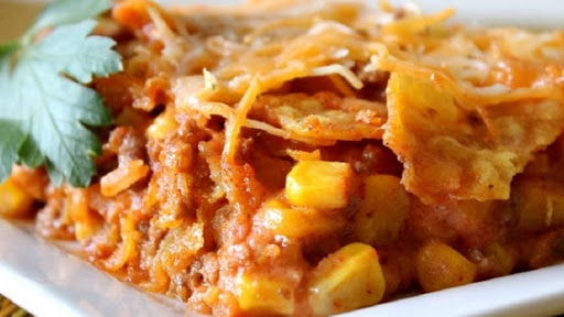 "A simple meal to whip up in less than an hour that even the kids are sure to love. Layers of seasoned ground beef, corn, tortilla chips and cheese are baked under a layer of Colby cheese. Monterey Jack is also good in place of the Colby cheese."