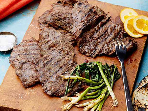 In a wide, shallow glass baking dish, scatter half of the orange slices, half of the onion slices and half of the garlic pieces on the bottom of the dish. Sprinkle the steak all over with salt and pepper and put in the dish on top of the orange and onion slices. Scatter the remaining orange, onion and garlic over the steak and pour in the beer and soy sauce. Cover with plastic wrap and marinate for 1 hour at room temperature or up to overnight in the refrigerator.