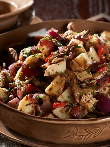 "Potato salad is a summer staple…but don't bore your taste buds! This updated recipe calls for grilled fixings plus a tangy oil and vinegar dressing."—David