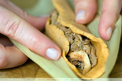 Assemble the tamales: spread masa about 1/8 inch thick on corn husk with fingers, leaving about ½ inch border along the sides and 2 inch border along the top and bottom of husk. Use about 2 Tbsp. of shredded meat to fill the tamal (like a cigar). Fold sides until they just overlap, fold narrow end under, and place tamal folded side down. Grandma Salazar tears thin strips of the corn husks to tie a “little belt” around each tamal to keep it secure. Although this isn’t necessary, it does look the nicest and makes each tamal a little gift to be opened.