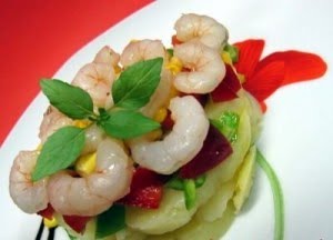 Sacar del adobo las gambas y el pepino y escurrirlos.