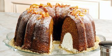 To fill the cake, invert the cooled cake to reveal the tunnel. Fill the tunnel with the cream cheese filling, spreading it evenly to the outer edges of the cake with a rubber spatula. (Note: It will look like the entire bottom of the cake is frosted.) Sprinkle chopped walnuts over the filling. Invert the cake on to a serving platter.