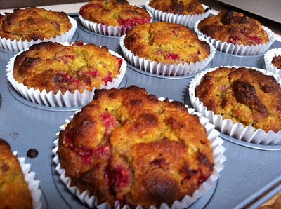 4) Gently mix in the berries and divide among 6 muffin cups. Bake for about 15 to 18 minutes, or until just turning golden on top.