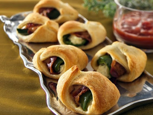 * 2On cutting board, unroll dough; separate dough into 8 triangles. From center of longest side to opposite point, cut each triangle in half, making 16 triangles. Place chile, cheese side down, on dough triangle. Fold 1 point of triangle over filling; fold 2 remaining points over first point. Place on ungreased cookie sheet.