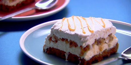 6. Soften white chocolate ice cream on counter for 15 minutes, then beat slightly to soften. Spread over hazelnut-toffee layer and freeze for 30 minutes. Drizzle top cake with remaining caramel sauce and freeze for 4 hours.