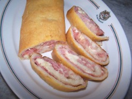 Top the entire sheet of dough with ham leaving a 1 1/2 inch border along one long edge. Repeat with the provolone then use the plastic wrap to roll up the Stromboli. Start with a fold about a quarter of the way up the width then peel back the plastic wrap before folding a second time. On the third fold you should end up with your seam centered on the bottom. Slip your hand under the plastic wrap for easy transport of the Stromboli to a baking sheet lined with foil and sprayed with nonstick spray.
