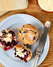 •Preheat oven to 375 degrees. Generously butter a standard 12-cup muffin pan and dust with flour, tapping out excess; set aside. In a medium bowl, whisk together flour, baking powder, and salt. Working over the bowl, toss blueberries in a fine sieve with about 1 1/2 teaspoons flour mixture to lightly coat; set aside the flour mixture and the blueberries.
