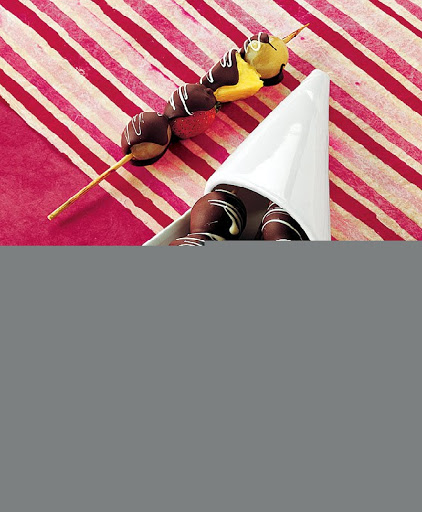 Fill a large metal bowl with ice and cold water; set aside. Put ⅔ of the semisweet chocolate into a metal bowl fitted with a candy thermometer. Set bowl over (but not touching) the simmering water, and, stirring occasionally, heat until chocolate reaches 115º. Remove bowl from heat (leave simmering water on), add remaining semisweet chocolate, stir until melted, then chill over ice bath, stirring constantly, until temperature reduces to 84º. Return bowl to pot of simmering water and heat, stirring occasionally, until chocolate reaches 88º to 89º (chocolate is now tempered). Remove bowl from heat and immediately spoon chocolate over 1 fruit skewer, turning skewer to coat. Repeat with remaining skewers.