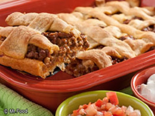 Unroll remaining can of crescent rolls on a lightly floured surface, and shape into a rectangle, pressing perforations to a seal; cut into 1-inch strips. Arrange strips in a lattice design over beef mixture.