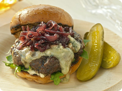 Burgers with red onion marmalade and Maytag Blue Cheese