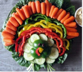 2) For the feathers: Cover a platter with the leaves of lettuce. To make the turkey's feathers, start with forming a circle with the cucumber slices towards the bottom of the platter. Above the cucumbers, form a semi-circle with the red peppers, then the yellow peppers, then the green peppers. Place the baby carrots vertically above the last row of peppers.