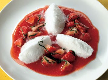 In a blender, purée remaining 1/2 pound strawberries and 3 tablespoons sugar until smooth. Divide purée among serving plates, put the islands on top, garnish with reserved strawberries and serve immediately.