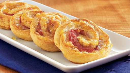 2 Unroll log of dough onto waxed paper, but do not separate into rolls. Set icing aside for another use. Spread mustard evenly over dough. Top with ham and cheese, overlapping slices. Carefully reroll dough jelly-roll fashion, starting with long side. Cut along perforations into 8 rolls. Place 1 1/2 inches apart on cookie sheet.