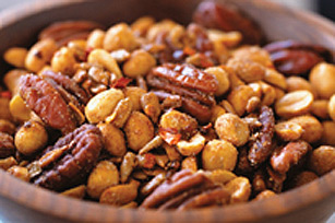 Melt butter, toss nuts with butter (about a pound, a little more, for this mixture.) Lay in baking sheet in single layer, and if you want sweetness, sprinkle with 2 t. plain sugar at this point. Bake for 10-15 minutes until absorbed and rich brown