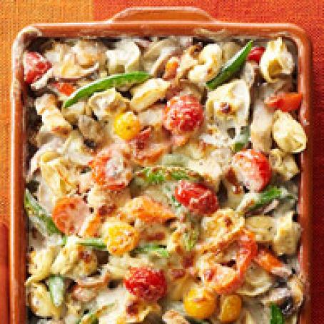 1. Preheat oven to 350 degrees F. Cook tortellini according to package directions, adding sugar snap peas and carrot for the last 1 minute of cooking; drain.