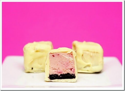 Slice cheesecake into 36 squares. Place on a parchment lined sheet and freeze until firm, at least 2 hours. Over a double boiler, carefully melt white chocolate, taking care not to scorch it. Stir constantly and remove from the heat before all the chocolate is melted - continuing to stir will melt the rest.