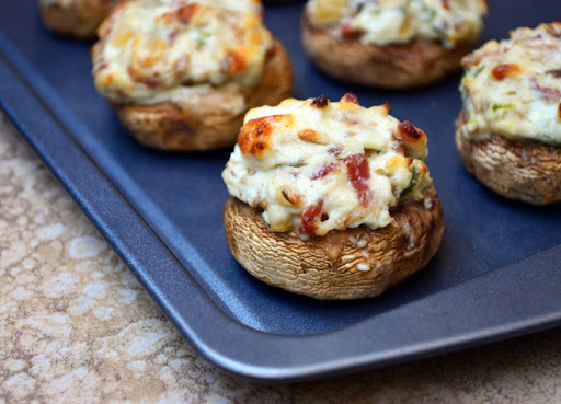 Arrange mushroom caps gills down on a baking sheet and lightly brush with olive oil. Bake in a 400 F oven for about 4 to 5 minutes or just until mushrooms start to leak. Turn mushroom caps to cavity side up and using a small spoon, fill with stuffing mixture. Return to oven and bake at 400 F for another 5 to 6 minutes or until filling is heated through and tops are golden brown.