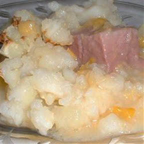 "This pie was made by my Nana, and my whole family loves it! Cubed ham is arranged in the bottom of a casserole dish, topped with creamed corn and briefly heated in the oven. Mashed potatoes are spooned on top, and then the pie is returned to the oven. Just before serving, it 's dotted with butter and slipped under the broiler to brown."