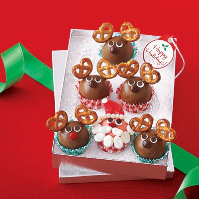 4. Pipe small dots of light cocoa candy melts on chocolate-coated truffles; on top of the melted dots, affix pretzel twists as antlers. Add brown and remaining red M&M's Minis as noses. Pipe small bits of white candy and attach mini chocolate chips as eyes. Refrigerate truffles until set, about 5 minutes.