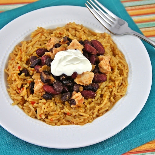 2. In a greased 8 x 8 inch baking pan, combine the chicken broth, the black beans, red kidney beans, salsa, garlic and cubed chicken.