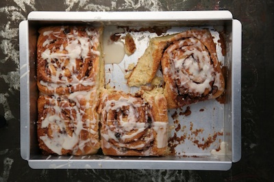 7. Transfer the pan of cinnamon rolls to a cooling rack; brush with remaining melted butter. Let cool for 5 minutes. Dip the tines of a fork into the icing and drizzle all over the rolls. Serve immediately.