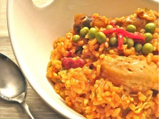 5) Allow to rest for about 5 minutes. Garnish with thinly sliced red pimentos and/or peas.