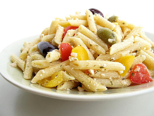 Drain pasta and return to pot. Add crumbled feta, tomatoes, bell pepper, and olives. Toss to combine. Pour over with vinaigrette and toss again to combine. Serve warm or chilled. Yield 6 to 8 servings.