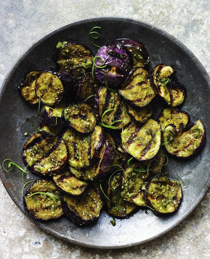 Eggplant is sensational charred and tenderized on the grill. This preparation with a soy-sesame sauce pairs especially well with grilled black cod or other white fish, or with pork tenderloin. Serve it warm or at room temperature.