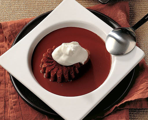 In a bowl, beat cream to soft peaks. Divide cakes among shallow serving bowls. Ladle sauce into bowls. Top with whipped cream and serve immediately.
