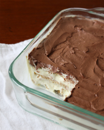 Melt chocolate and butter; cool slightly and stir in beaten egg yolks. Add sugar. Add vanilla and nuts. Line an 8 X 8 baking dish with a layer of very thinly sliced cake. Pour thin layer of chocolate mixture over cake. Repeat layers until mixture is gone and chocolate is the top layer. Refrigerate covered. Serve with whipped cream.