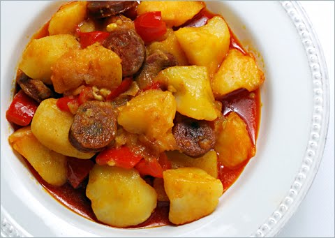 Add garlic and cook until fragrant, about 45 seconds. Stir in paprika, crushed red pepper flakes and bay leaf. Stir in wine and cook until it is slightly reduced, about 3 minutes. Add water, turn heat to high to bring to a boil. Water should almost cover potatoes; if not add a little more. When liquid is boiling, reduce heat to low and cook uncovered for 15 minutes, stirring occasionally. Cover pan and cook for another 10 minutes or more, until potatoes are tender.