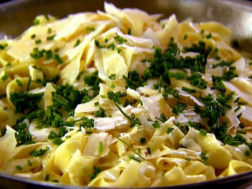 Serve the pasta in shallow bowls and garnish each serving with a generous sprinkling of chives and shaved Parmesan. Sprinkle with salt and pepper and serve at once.