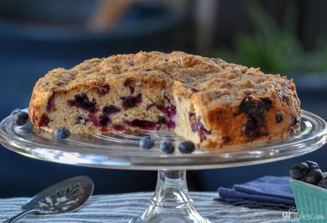 However you slice it, this scrumptious gluten free Blueberry Buckle Cake makes a coffee cake-like breakfast treat (anything with yogurt is breakfast, right?) or a respectable dessert, and it’s a great way to show off the abundant fresh berries of the season!