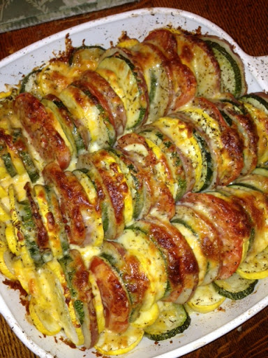Spray the inside of a square baking dish with non-stick spray. Spread the softened onion mixture in the bottom of the dish. Place the vegetables vertically in the dish in an alternating pattern. Sprinkle with salt, pepper and thyme.