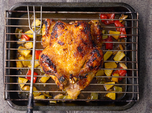 Allow the chicken to cool for 4-5 minutes on the roaster dish. Carefully remove the chicken and serve with the peppers and pineapple chunks.