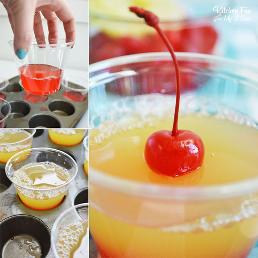Add pineapple/vodka jello to the cups evenly, chill again for 1 ½ hours.