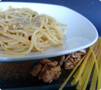 Place the walnuts, oil, salt, pepper, and nutmeg in a blender and blend well. Melt the butter in a frying pan, add the bread crumbs, and mix well. Boil the spaghetti in plenty of salt water, drain, and pour it into the frying pan with the bread crumbs. Toss over moderate heat for around two minutes, then add the walnut sauce and mix well. Sprinkle with the grated cheese and serve.