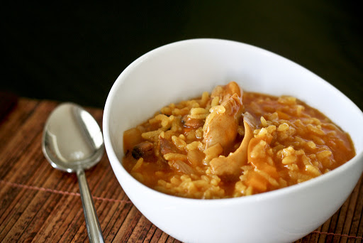 Place the rice in a medium-sized bowl. Stir the saffron threads and annatto powder into the warm water, then add the water to the bowl and give it a quick stir. Set aside.