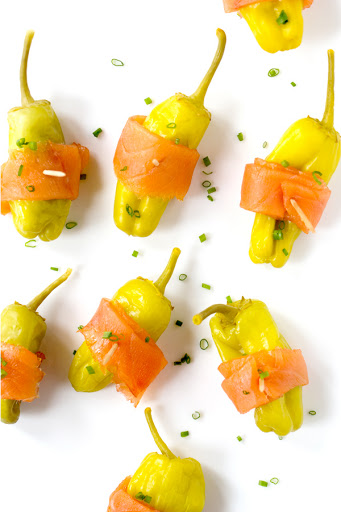 Make a 1" incision lengthwise in each pepperoncino. If you like, remove and discard the seeds. Dry peppers with paper towels; set aside. Mix cream cheese, crème fraîche, chives, zest, salt, and pepper in a bowl; transfer to a pastry bag fitted with a ½" tip. Pipe 1-1½ tbsp. filling into peppers. Wrap a strip of salmon around each pepper and secure with a toothpick; garnish with more crème fraîche and chives, if you like.
