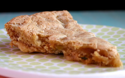 I took my favorite blondie bars recipe, added sauteed Granny Smith apples and baked it in a pie dish. It turned out perfect! I love the wrinkled look of this pie. And each slice – ooey gooey apple goodness!