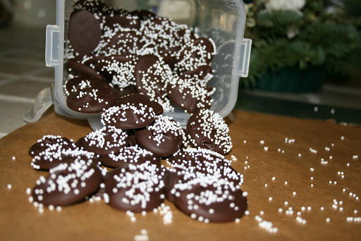 Place nickel sized dots on parchment paper. After 20 minutes sprinkle with white non-pariels. Let cool at least 4 hours.