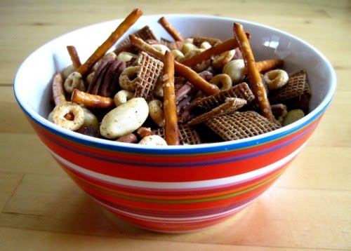 Melt butter, add seasonings. Pour over cereals etc. in large roaster. Bake at 250 degrees for 1-2 hours. Stir every 10-15 minutes.