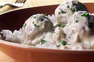 ADD flour to drippings in skillet; stir until well blended. Cook 1 minute. Add broth; bring to boil. Reduce heat to low; simmer 3 minutes or until thickened. Stir in sour cream and remaining 1/4 tsp. nutmeg. Return meatballs to skillet; simmer 2 minutes or until heated through. Serve over hot cooked rice or noodles.