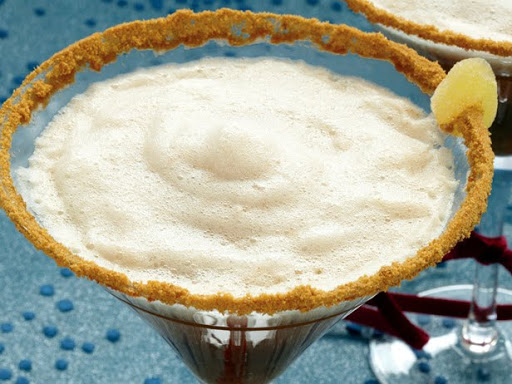 Pour enough ginger beer into a saucer to cover and dip a martini glass into the saucer to coat the rim. Dip into a saucer with ground cookie. Scoop ice into shaker. Pour ginger juice, rum and cinnamon schnapps into a shaker. Add a pinch of ground cloves. Separate an egg and add egg white to shaker. Shake vigorously for at least 20 seconds until drink is frothy and foamy. The longer you shake, the foamier the drink. Add ginger beer and stir slightly. Pour into glass.
