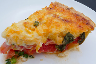 Layer the tomato slices, basil, and onion in pie shell. Season with salt and pepper. Combine the grated cheeses and mayonnaise together. Spread mixture on top of the tomatoes and bake for 30 minutes or until lightly browned.