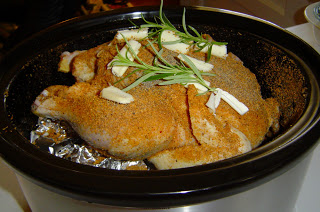 Wash your chicken inside and out and remove that weird bag of stuff they stick inside it (yuck) and discard it. If you are leery of handling a raw chicken, invest in a some latex gloves. Sprinkle the chicken inside and out with Lawry's poulty and chicken rub, pepper and garlic powder. Dot with about a 1/3 stick of butter and put some sprigs of fresh rosemary on top. The rosemary is optional but it makes it smell so good cooking. Put the top on and cook 8 hours on low or 4-5 on high depending on how your slow cooker cooks. They all seem to vary. I ususally do mine about 4.5 hours on high. Carefully remove from slow cooker and place on cutting board. Let it rest 10 minutes before you carve it or you will lose a lot of the juices and your chicken will be dry.