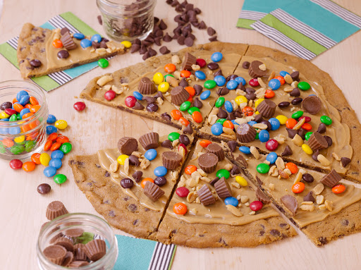 Evenly press the cookie dough on the pizza pan and spread it out to the edges. Make sure the dough completely covers the bottom of the pan.