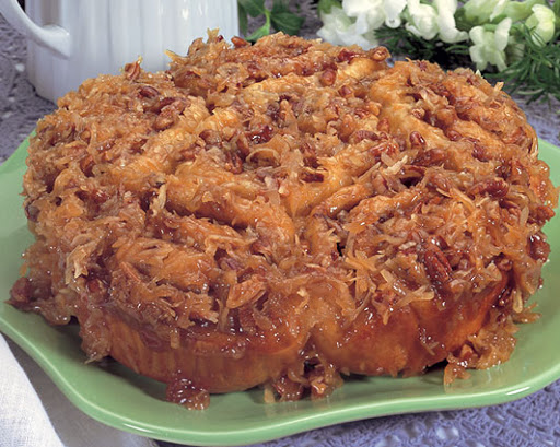 - Combine and spread evenly in bottom of pan. Follow recipe for Coconut Pecan Caramel Rolls.